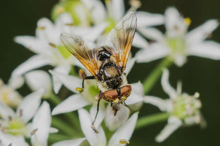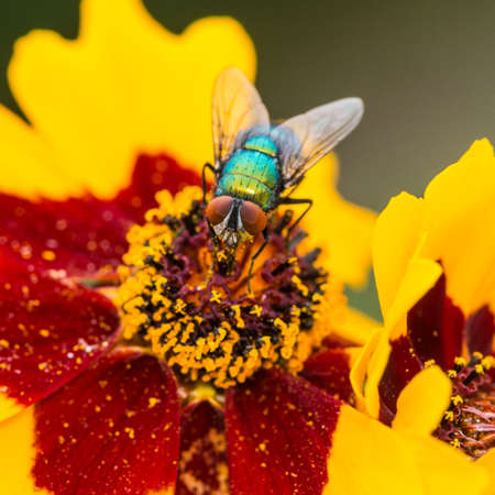 a kind of insects named red-headed flies on the flowers, in the natural wild state, Luannan County, Hebei Province, China.