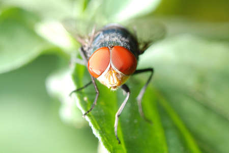 Close up details of large common fly sitting on green leaf with nature blurred background.