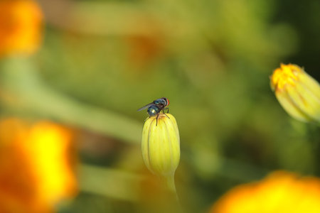 Macro Photography of Housefly on Flower Isolated on Black Background