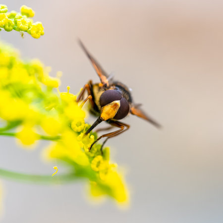 The insect sits on yellow flowers. The wasps feed on pollen. Macro - flying insect