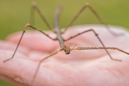 Portrait of a stick insect close-up on the biologist's hand. The study of rare exotic ghost insects