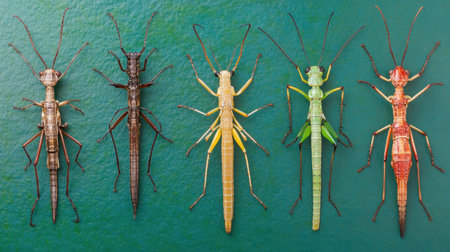 This image showcases a vivid arrangement of various insects exhibiting distinct colors and patterns against a bold backdrop. Each specimen represents a fascinating aspect of biodiversity.
