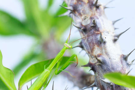 Green grasshopper, side view, hanging on the Crown of thorns tree branch, isolated on white background.