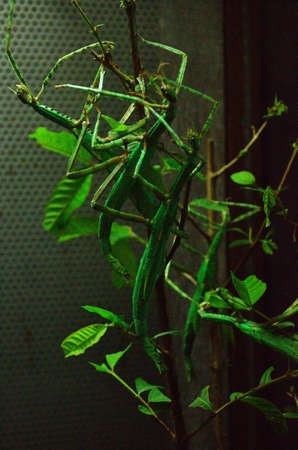 Young juvenile green walking stick, stick bug, phobaeticus serratipes standing on green leaf. Animals, nature