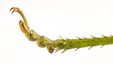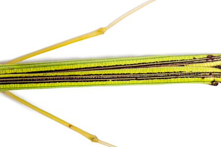 Walking Stick insect isolated on a white background. Phasmatodea - Medauroidea extradenta. Focus on a head. Macro Image.