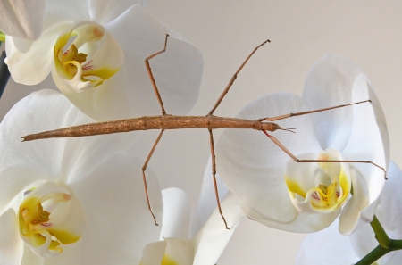 Yellow Flying Stick, Necroscia annulipes, phasma, in front of white background