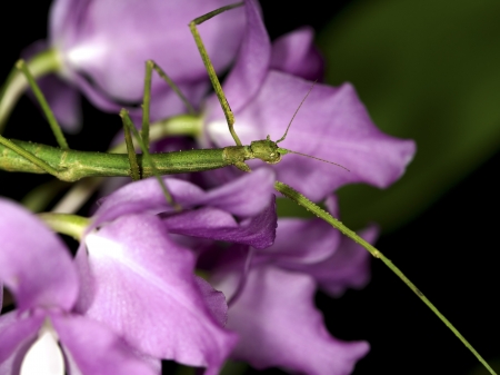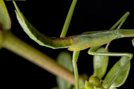 Close-up of a Texas Unicorn Mantis (Phyllovates chlorophaea ) against black background.
