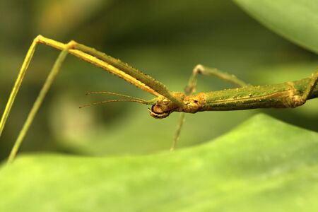 Vietnamese walking stick macro photography on green background. Close up to the head.