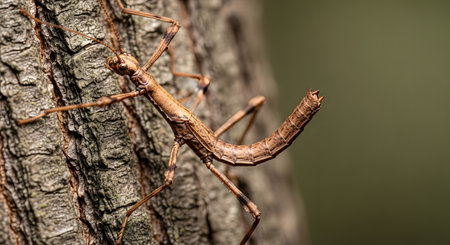 Walking stick insect trying to blend in and camouflage on a tree branch stick.
