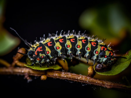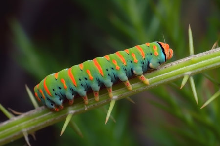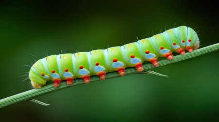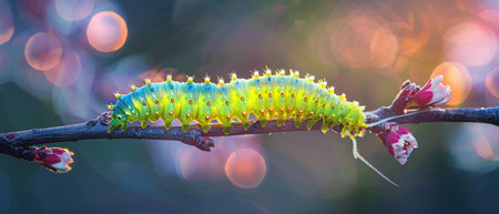 A striking and vibrant caterpillar gently crawls on a bright green stem, set against a softly blurred bokeh background. Ideal for nature lovers.