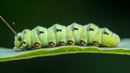 A stunning close-up of a green caterpillar resting on a leaf, showcasing its detailed patterns and vibrant colors against a blurred green backdrop, illustrating the beauty of nature.
