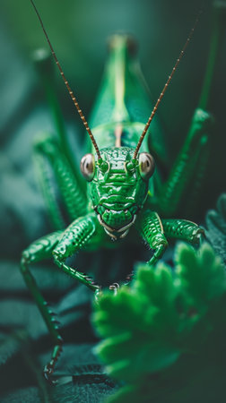 This stunning macro photograph captures the intricate detail of a vibrant green insect. Its striking features, including vivid colors and delicate textures, evoke the beauty of nature.