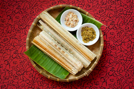 Delicious rice baked on a fire in a bamboo. Traditional vietnamese cuisine served in restaurant in Ba Ria, Vietnam.