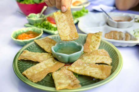 Close up of crispy Deep Fried Wontons stuffed with pork on a green plate with sweet sauce in a restaurant