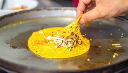 A skilled chef's hand carefully folds a golden, lacy Vietnamese sizzling crepe (Banh Xeo) on a hot griddle.