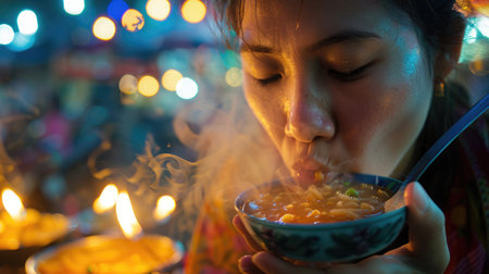 A woman is enjoying a bowl of staple food with a spoon, indulging in her food craving. She is savoring the dish made from a delicious recipe and sharing it with delight AIG50