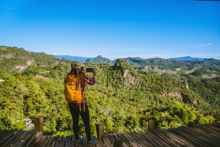 The woman standing at the view point. Enjoy shooting the natural beauty of the mountains.