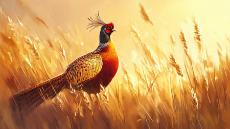 Vibrant pheasant in golden sunrise field. That the image is generated using AI.