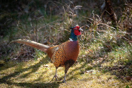 Male pheasant walking on the grass in a sunny day.