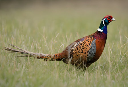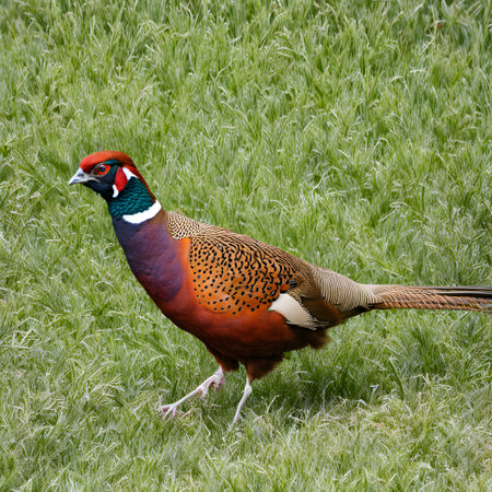 colorful pheasant gracefully walks through verdant grass, its iridescent feathers shimmering in the sunlight. The elegant bird stands out beautifully against the bright backdrop.