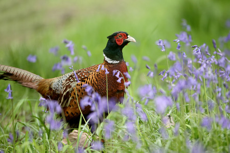 Common pheasant, Phasianus colchicus, single male in bluebells, Warwickshire, May 2015