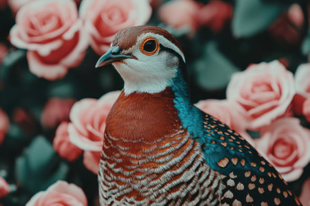 A vibrant bird perched among blooming roses in a stunning floral background.