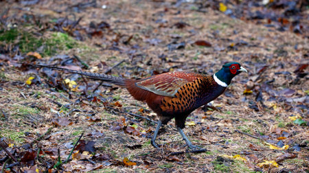 Golden pheasant walking through a forest floor covered in autumn leaves, its vibrant feathers standing out