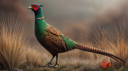experience the stunning beauty of a pheasant in this photo-realistic image. admire the intricate feather patterns, vibrant colors, and majestic pose of this regal bird. a must-see for bird lovers and nature enthusiasts alike.keywords: photo-realistic, pheasant, bird, feather patterns, vibrant colors, nature, bird lovers, majestic pose, regal bird, intricate. ai generated