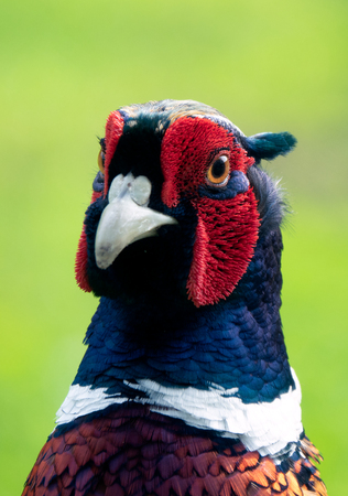 Close up portrait of a male common pheasant in Scotland. Game bird released for hunting