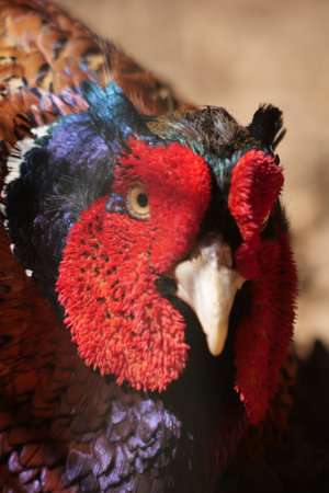 This close-up photograph captures the intricate details of a colorful pheasant, highlighting its vibrant feathers and striking facial features. Perfect for wildlife enthusiasts.