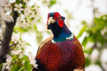 pheasant sitting in the branches of a flowering cherry tree. Close up photo