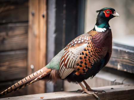 Stunning golden pheasant wild bird sat on a wooden fence. Rural wildlife landscape in Norfolk UK. Male and female pheasants are imported in the the UK often hunted and shot down legally as game for sport by land owners in the UK.