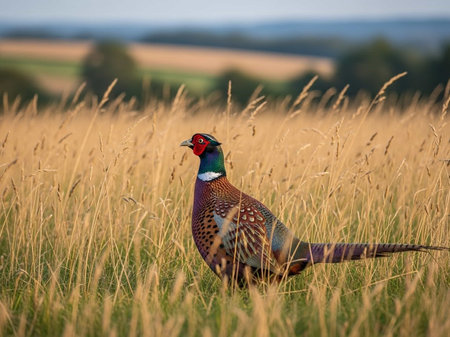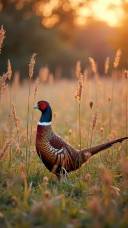 Majestic pheasant in golden sunset grassland. That the image is generated using AI.