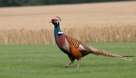 A vibrant male pheasant Phasianus colchicus standing in a grassy field under soft light, showcasing its colorful plumage with a patterned tail and striking red face.