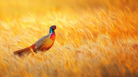 Vibrant pheasant in golden sunrise field. That the image is generated using AI.