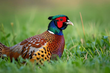 colorful pheasant gracefully walks through verdant grass, its iridescent feathers shimmering in the sunlight. The elegant bird stands out beautifully against the bright backdrop.