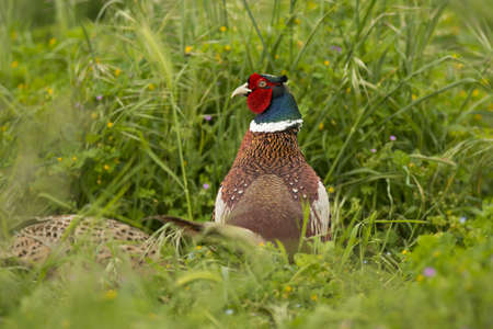 Colorful wild pheasants in the grass