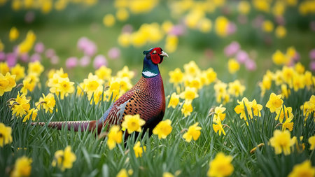 Pheasant and yellow daffodils in a spring garden