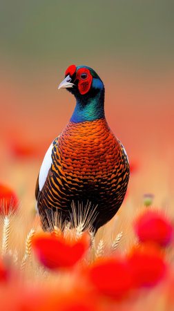 A vibrant pheasant stands among colorful wildflowers in a serene natural setting.