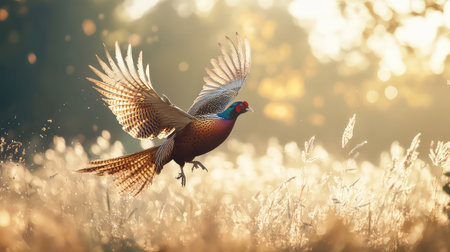 A vibrant pheasant takes flight in the warm glow of sunrise, showcasing its colorful feathers against a soft-focus field of grass, embodying natural beauty.