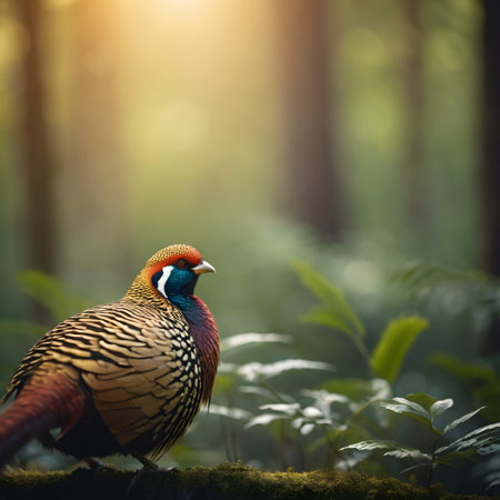 Wild pheasant in forest habitat with blurred background, perfect for text placement.