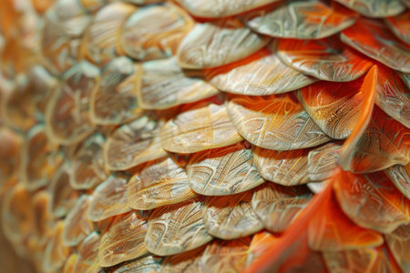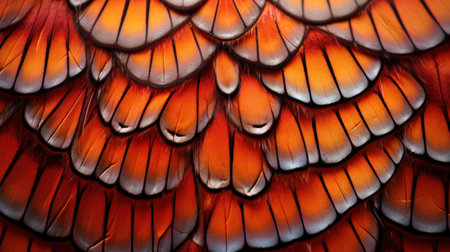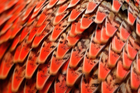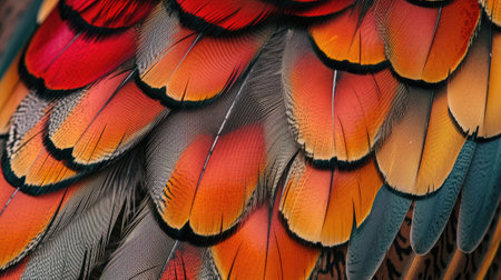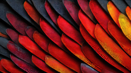 This stunning close-up captures the vivid red and orange hues of feathers, highlighting intricate textures and stunning natural patterns perfect for artistic or decorative use.