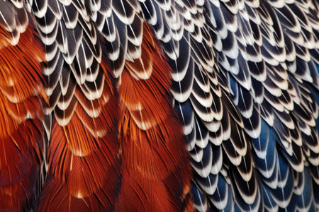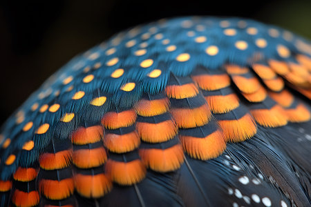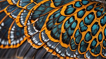 Stunning close-up of colorful bird feathers showcasing intricate patterns of orange, blue, and black. perfect for nature enthusiasts, this image highlights the beauty and diversity of avian plumage. Generative AI