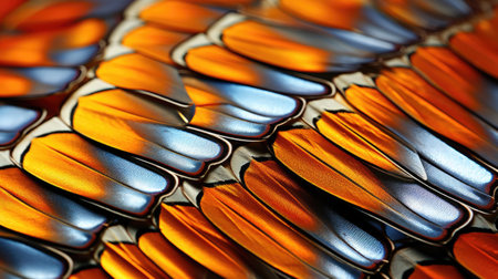 A close-up showcases the mesmerizing colors and patterns of butterfly wing scales, highlighting natures vibrant designs.