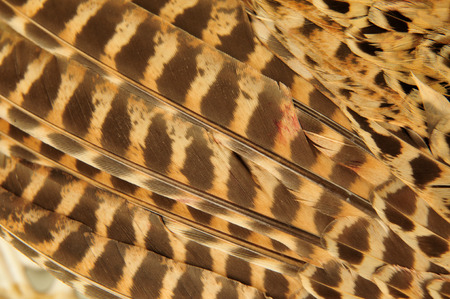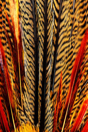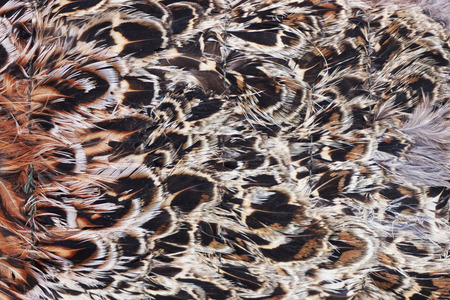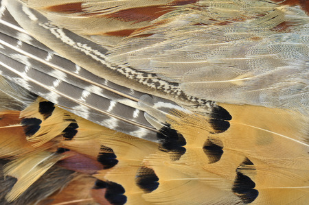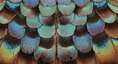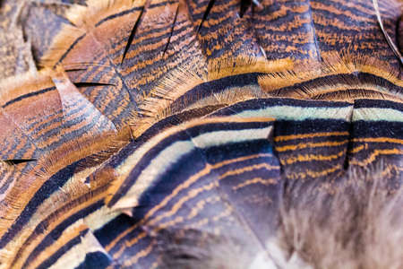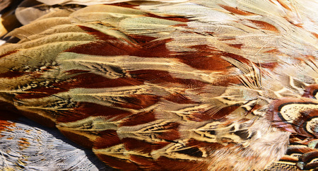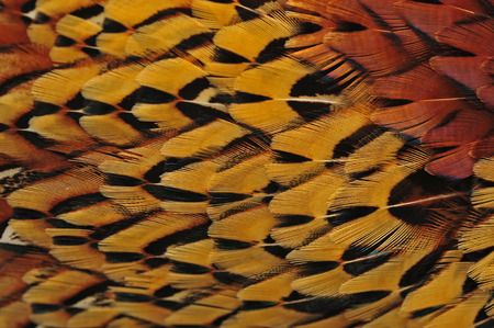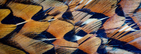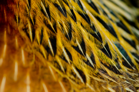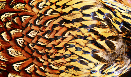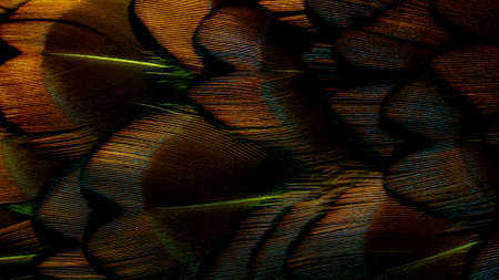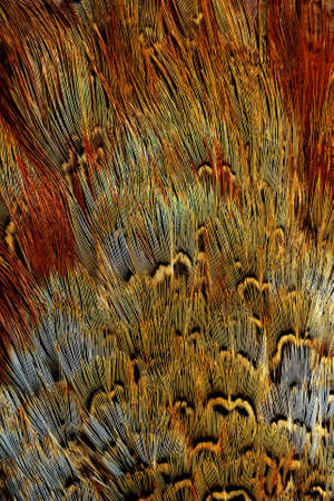 Closeup abstract background image of colorful ring-necked pheasant feathers.