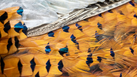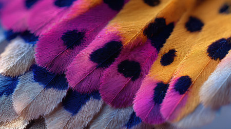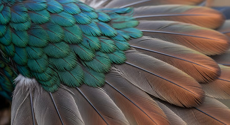 Explore the intricate details of colorful bird feathers in this close-up image. The vibrant tones and patterns create a stunning visual showcase of nature's beauty.
