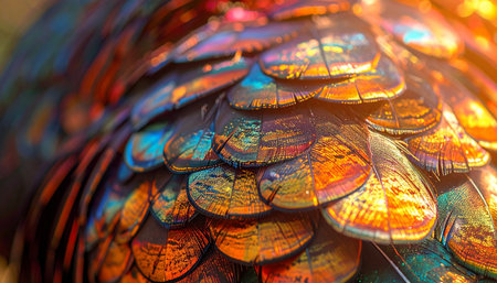 A mesmerizing macro view captures the intricate details of iridescent feathers, shimmering with a spectrum of fiery orange, cool blue, and rich gold. Bathed in warm, glowing sunlight, the layered texture creates a vibrant, abstract pattern, evoking a sense of natural wonder and opulent beauty.