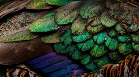 Close up of iridescent peacock feathers creating a beautiful natural pattern, showing the intricate details and vibrant colors of the plumage
