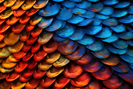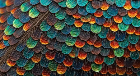 Vibrant feathers display a stunning array of colors and textures, highlighting the intricate patterns found on a birds skin. This captivating close-up reveals the natures of artistry.