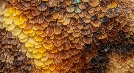 Intricate and detailed close up of textured feathers showcasing rich brown tones and unique patterns, highlighting beauty of nature design